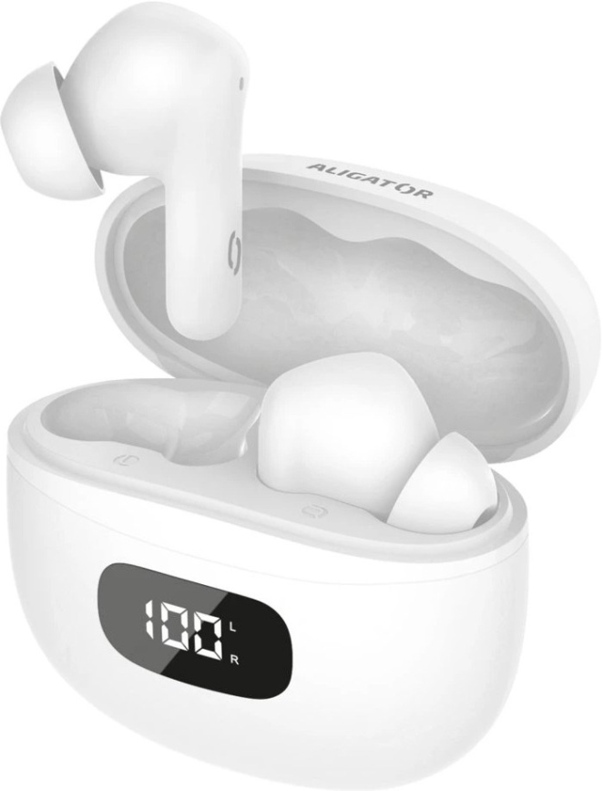 Aligator TWS08WT - Draadloze oordopjes met actieve ruisonderdrukking (ANC), 200 mAh oplaadcase + 2x 30 mAh oordopjes, IP40, wit