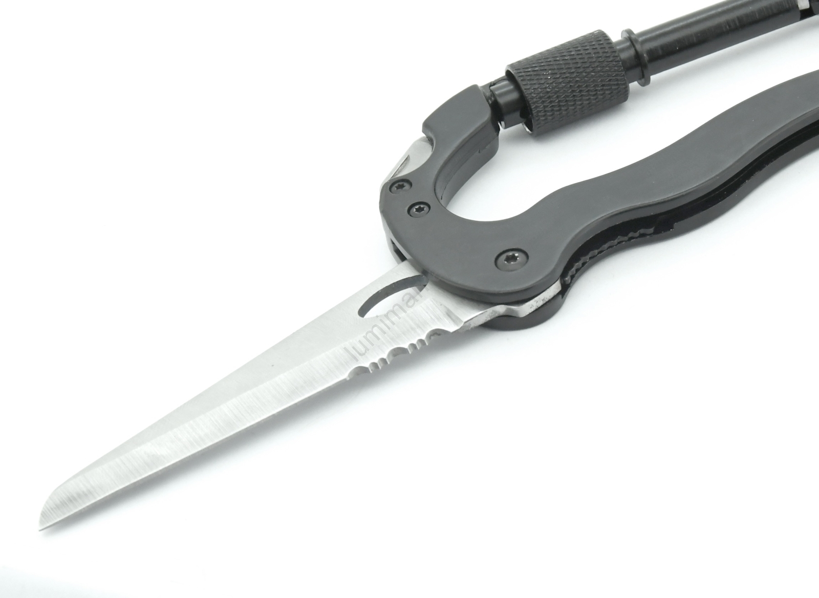 • De karabijnhaak is uitgerust met een mes van 7,5 cm lengte met een zaagtandgedeelte.