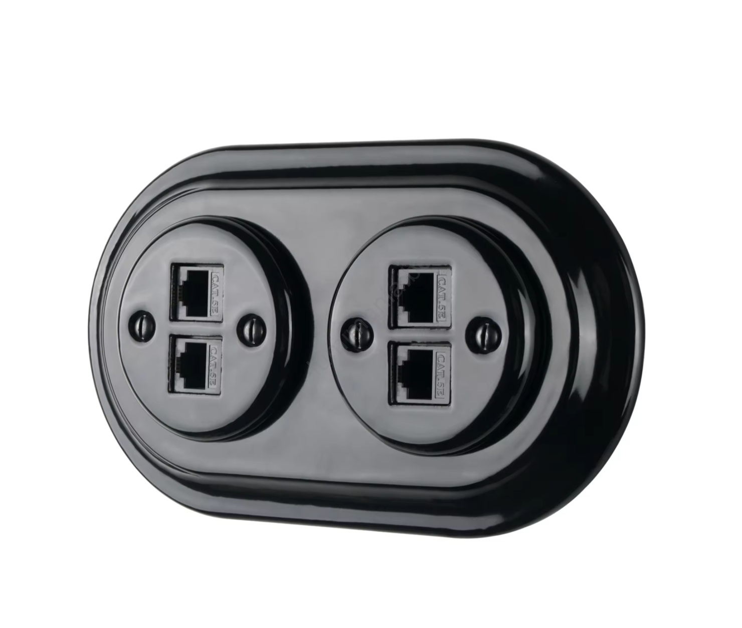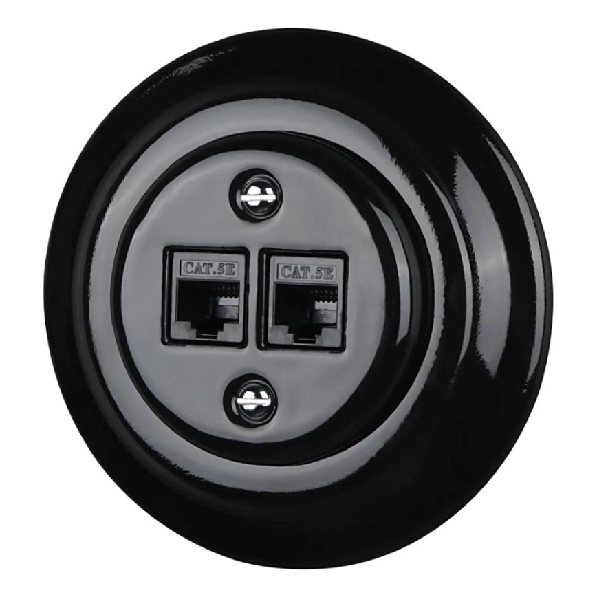 Bohemia-Design - Retro porseleinen Ethernet-wandcontactdoos met afdekraam, 2x CAT5e, zwart