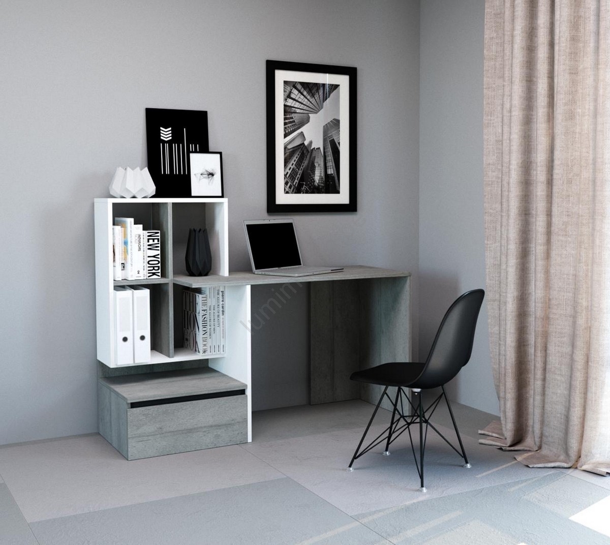 • Het rechthoekige werkblad wordt ondersteund door een zijplank met twee open vakken, ideaal voor het opbergen van boeken, kantoorartikelen of decoratie.