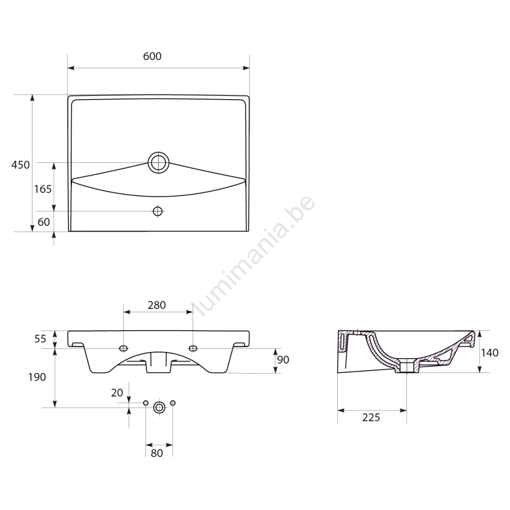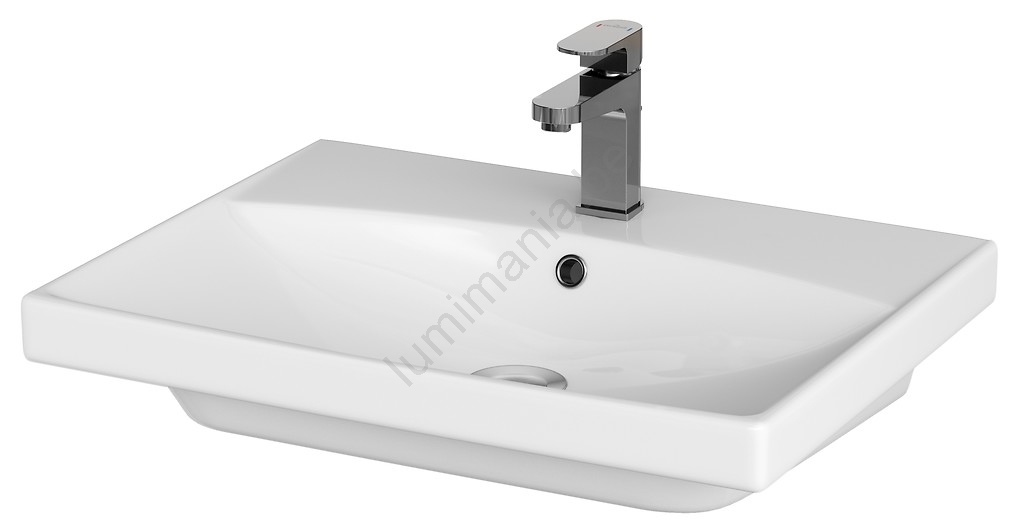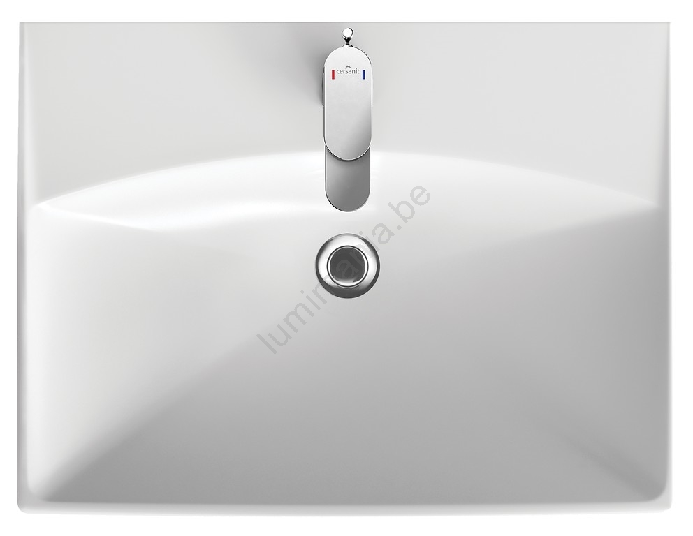 • De keramische wastafel heeft een klassieke rechthoekige vorm met een kraangat en overloop.