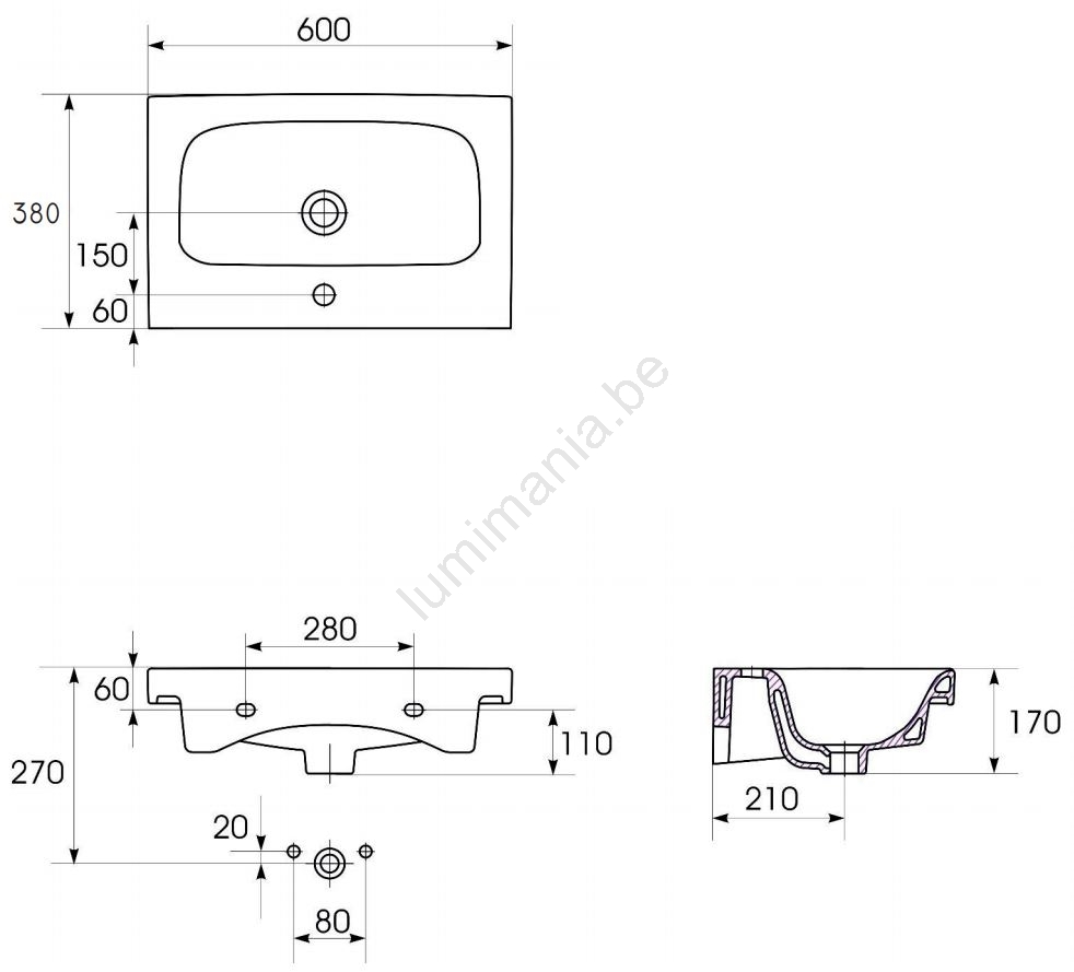 • De keramische wastafel heeft een klassieke rechthoekige vorm met een kraangat en overloop.