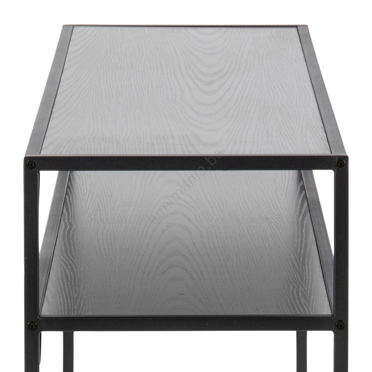 • Bovenblad en plank in zwart grof melamine, onderstel van mat zwart staal met een grove poedercoating.