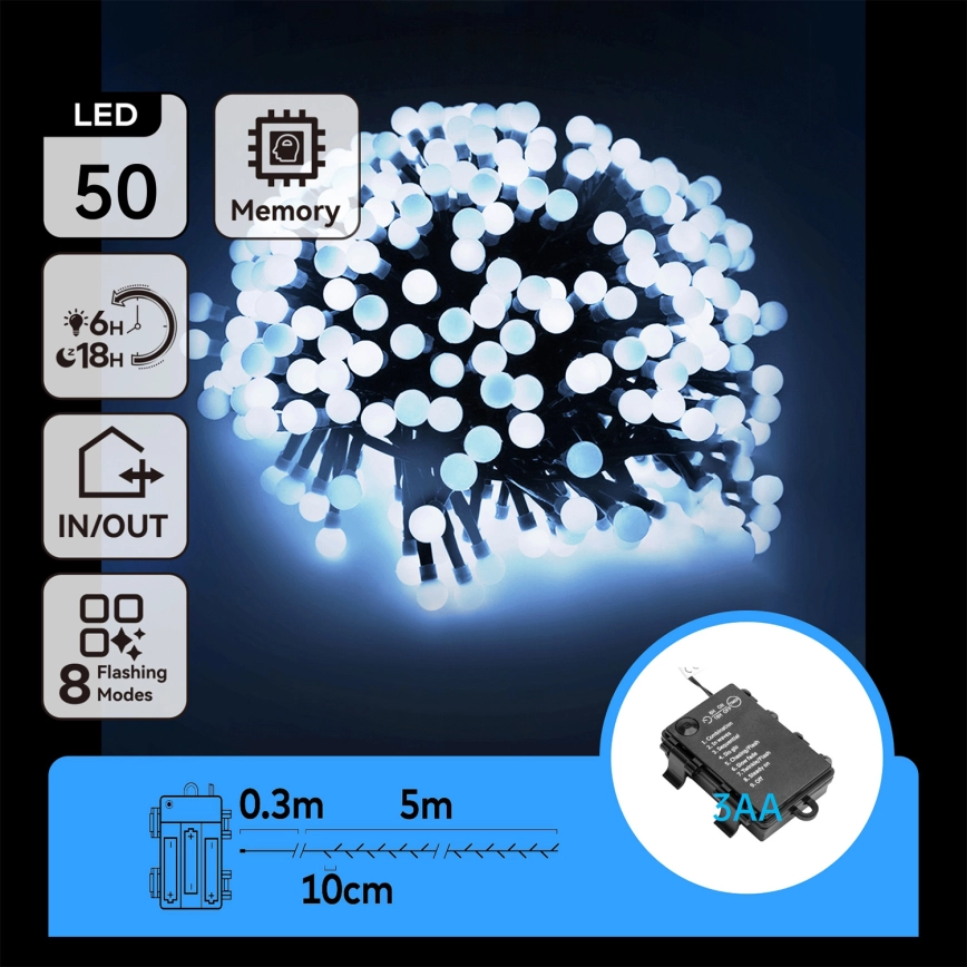 Aigostar - Guirlande lumineuse d'extérieur 50 LED / 8 fonctions, 3xAA, 5,3 m, IP44, blanc froid