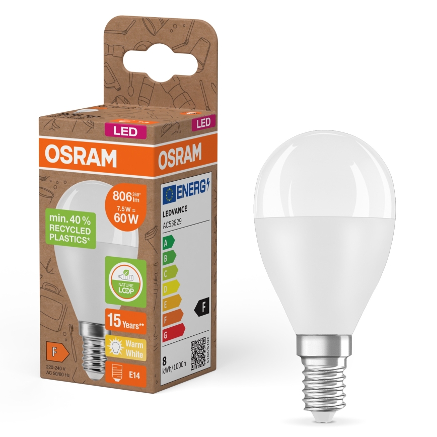 Ampoule LED en plastique recyclé P45 E14/7,5W/230V 2700K - Osram