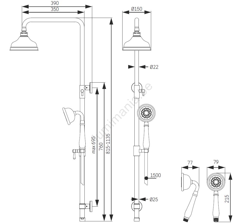 • Barre de douche et pomme de tête en acier inoxydable avec finition PVD.