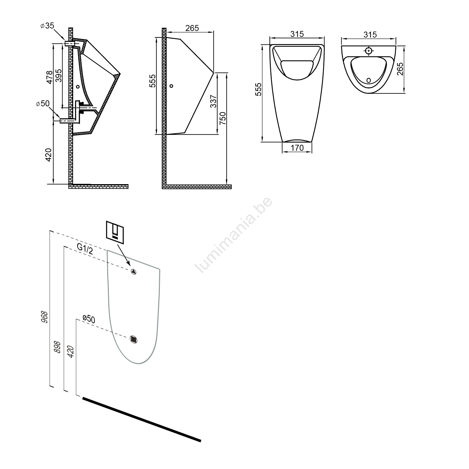 • L'alimentation d'eau arrière permet une installation discrète des conduites derrière la paroi.