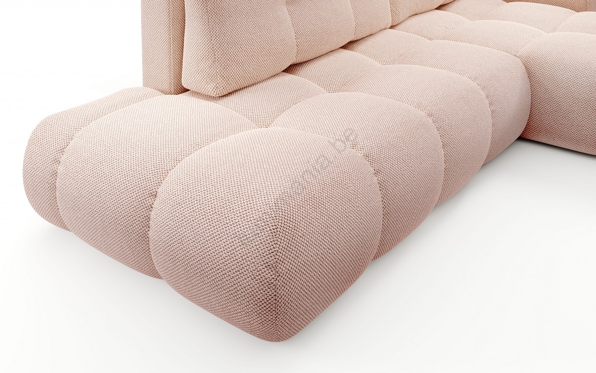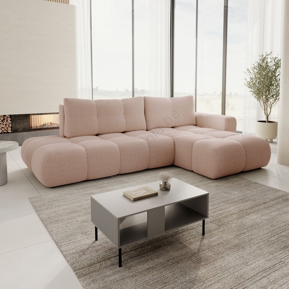 Canapé d'angle convertible rembourré ALMADA en L, avec coffre de rangement, côté droit, rose