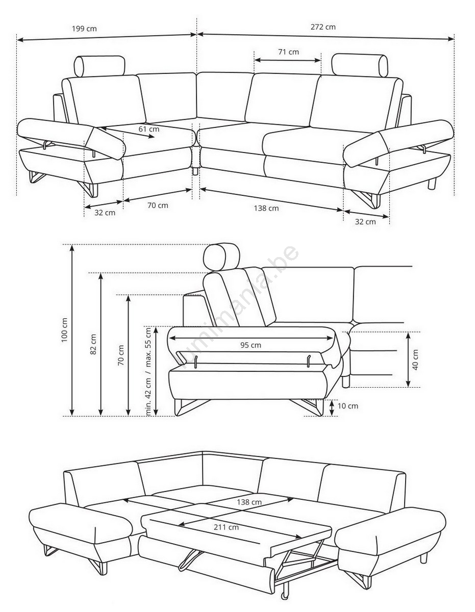 • Grâce à la fonction couchage (mécanisme type dauphin) il se transforme facilement en un espace de couchage confortable.