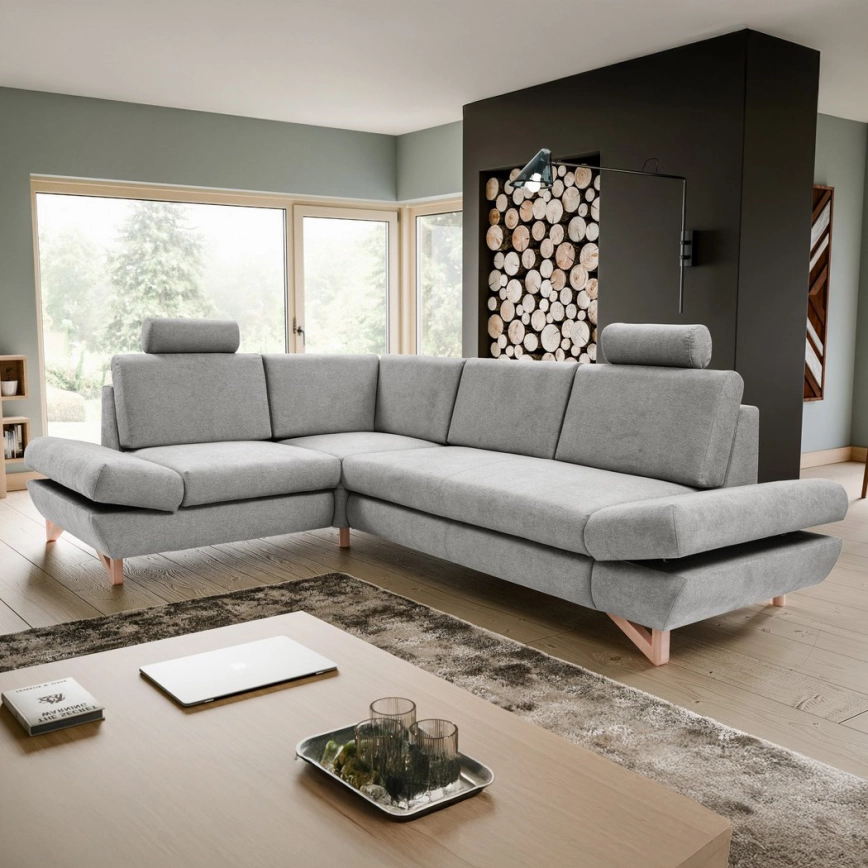 Canapé d'angle convertible rembourré AVESTA en L, avec coffre de rangement, angle gauche, gris