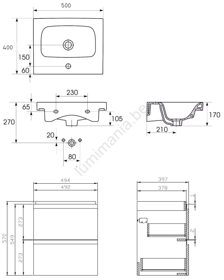 • Le lavabo en céramique présente une forme rectangulaire classique avec un trou pour robinet et un trop-plein.