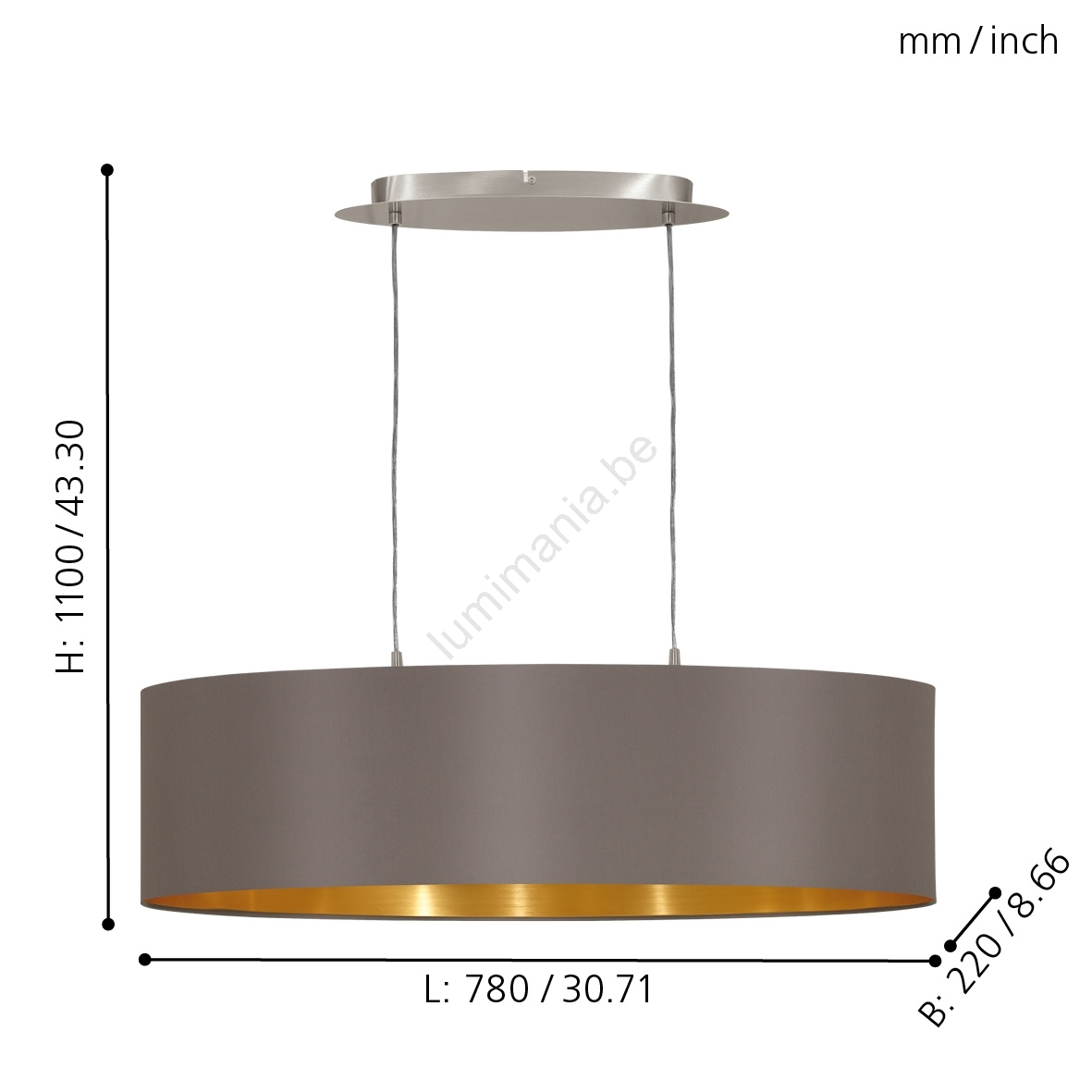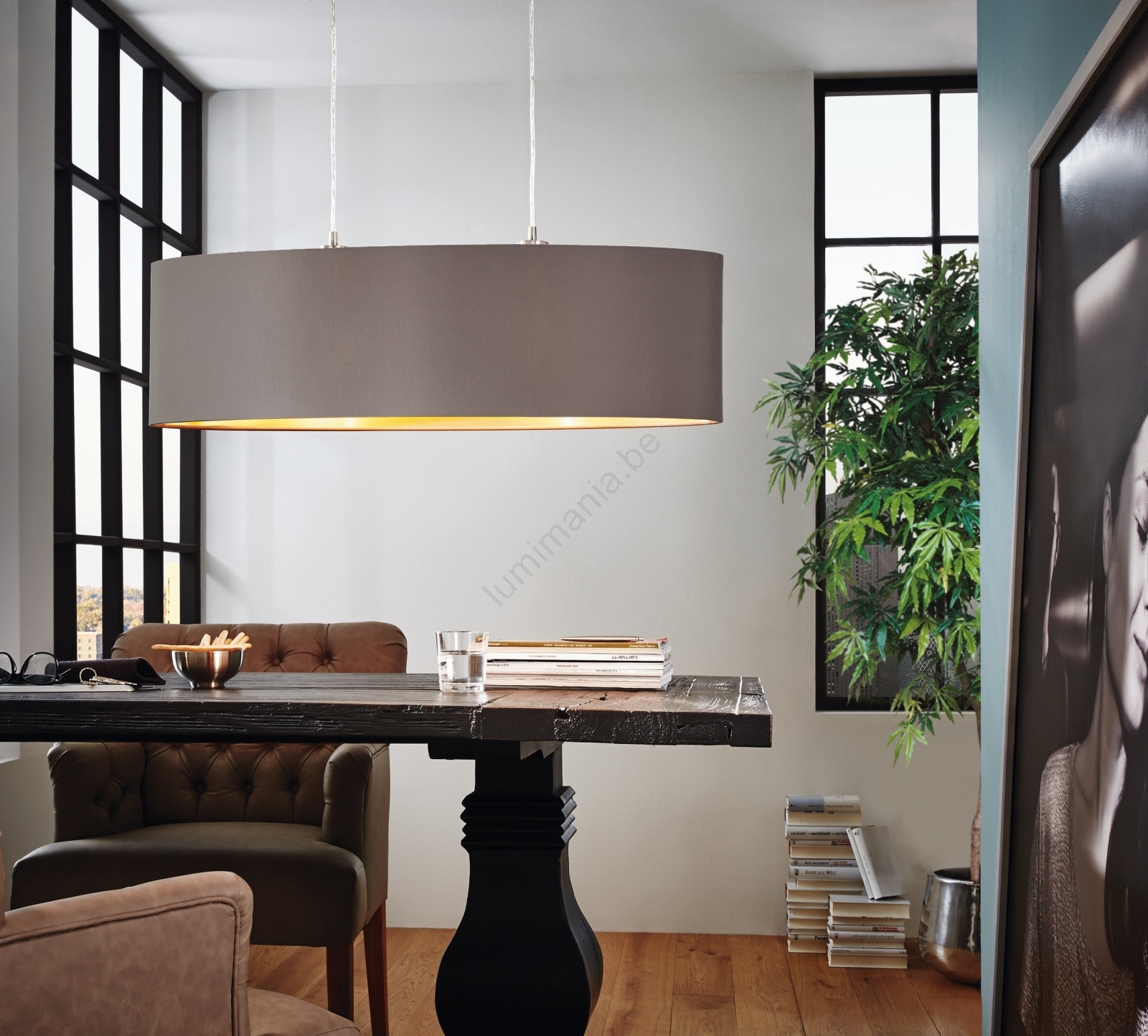 • L'apparence du luminaire est mise en valeur par un abat-jour ovale en textile, cappuccino à l'extérieur et doré à l'intérieur, complété par une suspension métallique.