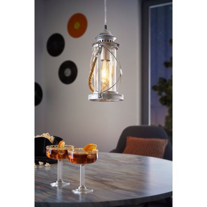 • Lanterne suspendue vintage de couleur argentée avec patine et corde évoquant un style maritime.