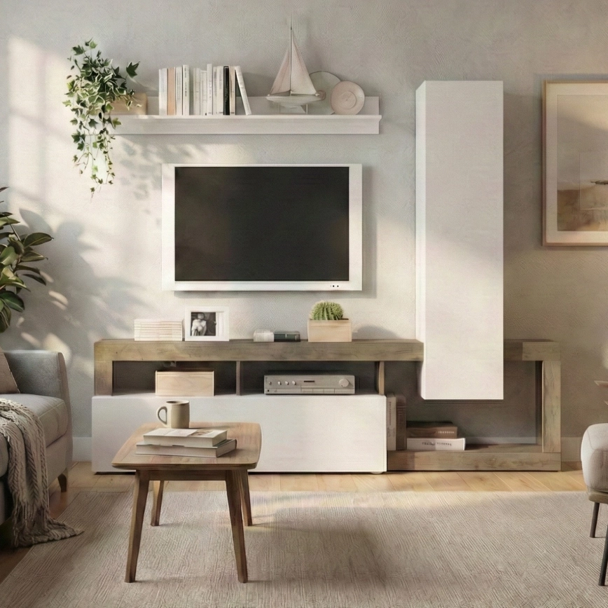 • Comprend un spacieux meuble TV avec des étagères ouvertes pour les appareils multimédia et des compartiments fermés pour un rangement discret.