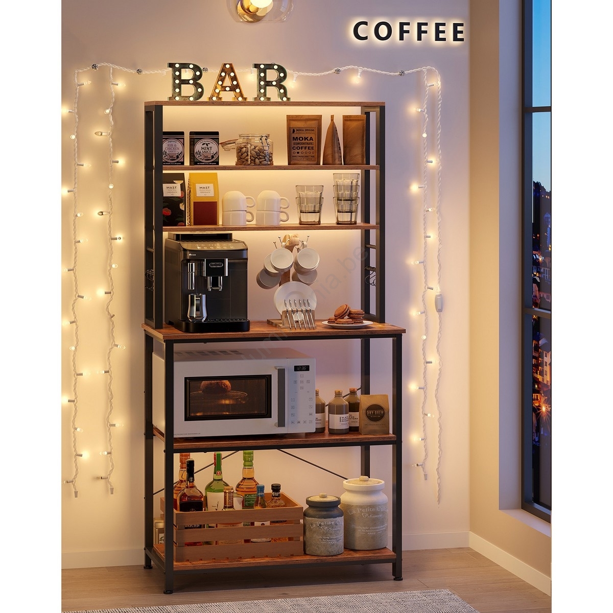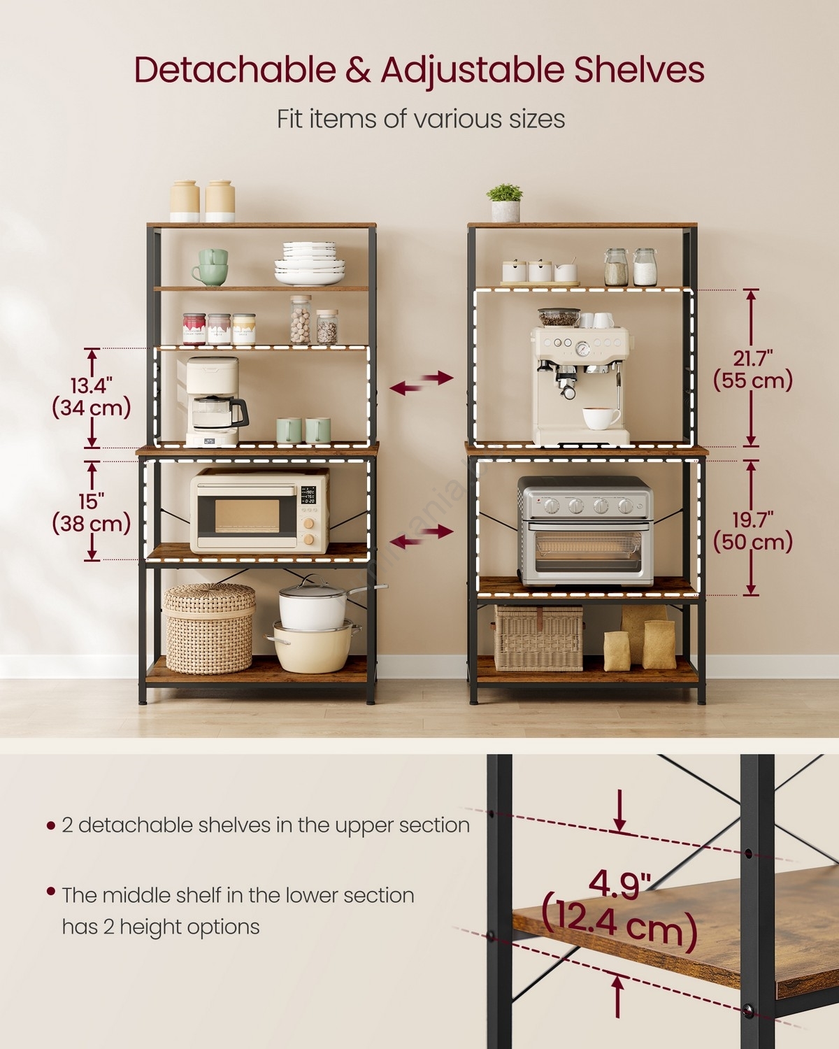 • L'étagère inférieure centrale peut être réglée sur 2 hauteurs, vous permettant d'y placer des appareils de différentes tailles, du mixeur à la friteuse à air jusqu'aux casseroles et poêles.