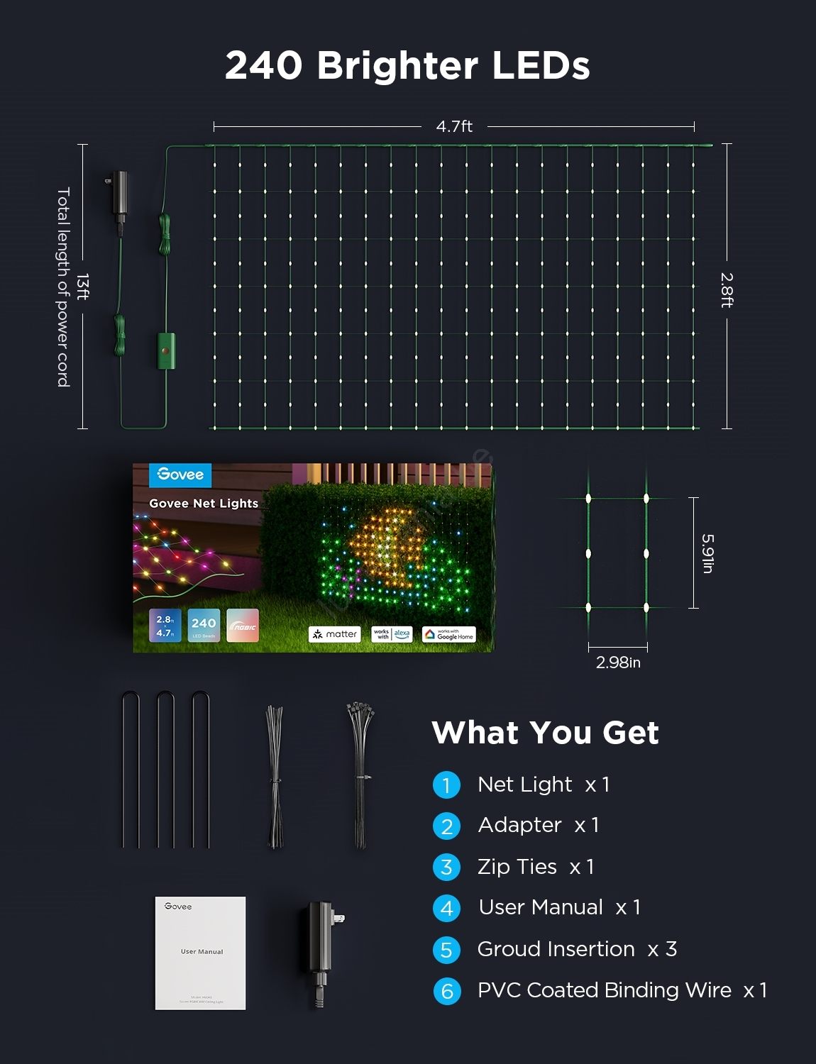 Govee - LED RGBIC Filet d'éclairage extérieur 143x85cm Wi-Fi Matter IP65