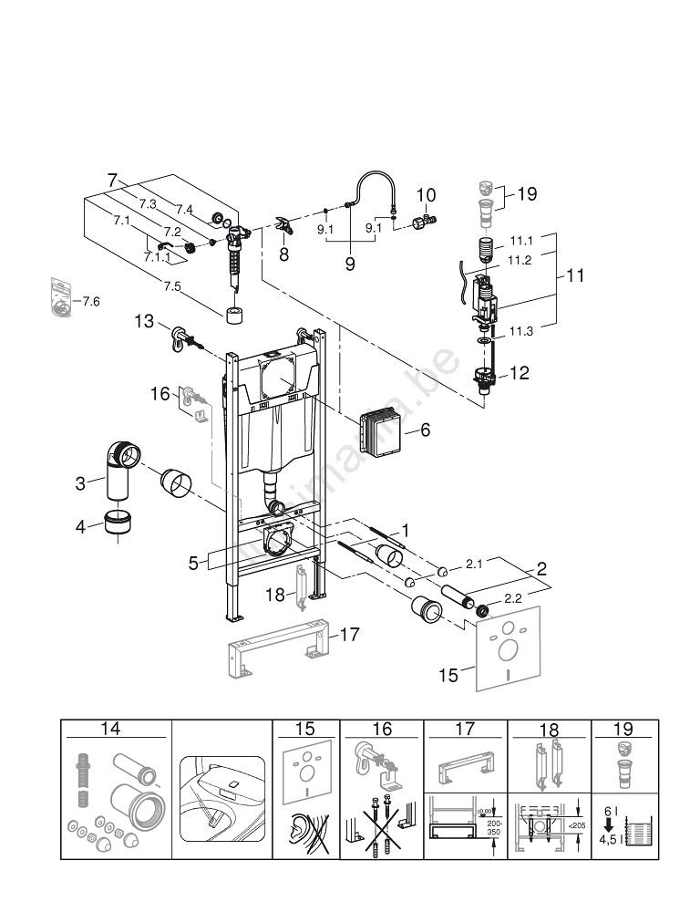 • Coude d'évacuation Ø 90 mm avec réglage de profondeur et réduction Ø 90/110 mm.