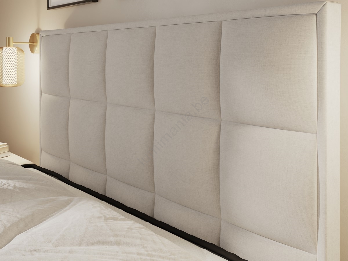 • Grâce à sa tête de lit haute au matelassage carré, à son matelas moelleux et à son cadre bas entièrement tapissé, le lit dégage une impression à la fois chaleureuse et sophistiquée.