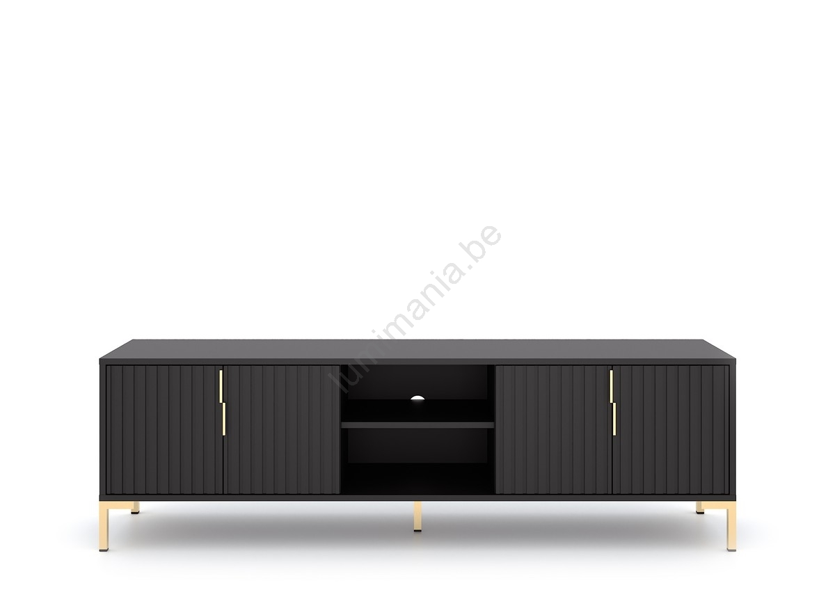 • Il dispose de deux compartiments latéraux fermés, chacun avec deux portes munies de poignées symétriques, des cannelures, et de deux étagères ouvertes avec un passage pour câbles au centre.