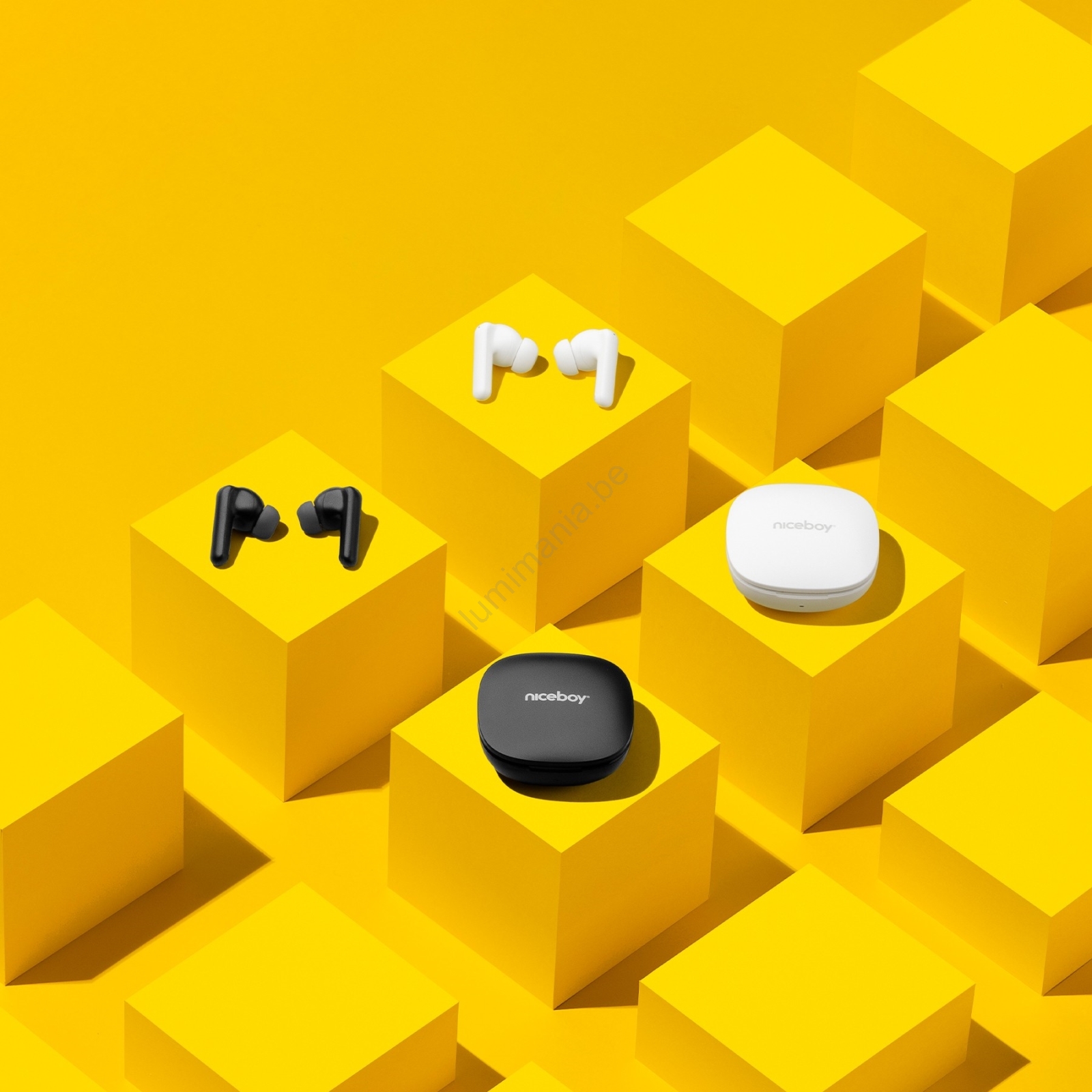 • Les écouteurs Niceboy Pins 4 PRO offrent un son exceptionnel et, grâce à la réduction active du bruit (ANC), vous garantissent un calme parfait pour l'écoute.