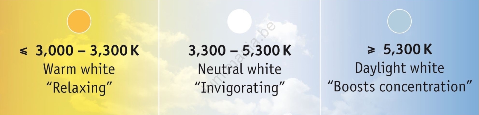 • Il est possible d'obtenir tout, de la lumière de travail blanche à la lumière du jour, jusqu'à un éclairage relaxant en blanc chaud (3000-6500 K).