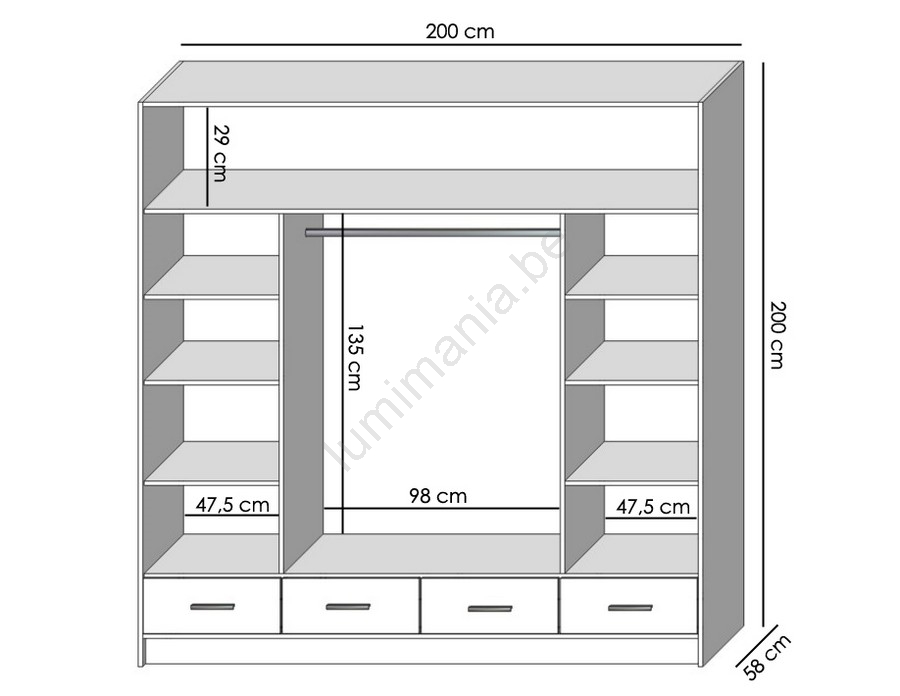• L'armoire dispose de 8 étagères ouvertes, 4 tiroirs, une tringle pour vêtements et une étagère supérieure pour ranger sacs et articles saisonniers.
