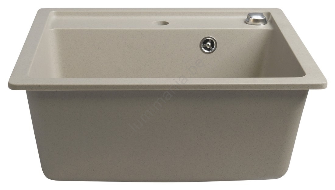 • L'évier est fabriqué en granit et présenté dans une teinte beige.