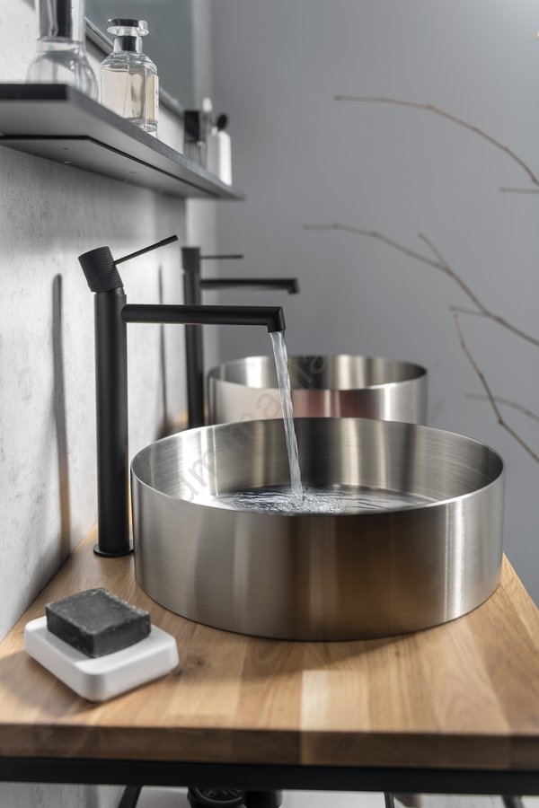 • Le mitigeur affiche des lignes épurées et des détails de style industriel.