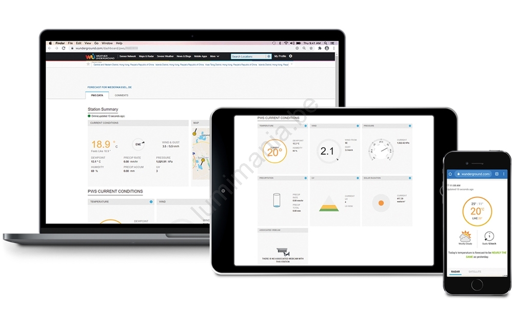 • Compatible avec les appareils connectés, accès en ligne à l'historique, aux données et aux plateformes météorologiques publiques mondiales „Weather Underground" et „Weathercloud".