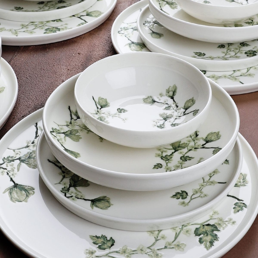 Service de table 24 pièces en porcelaine, blanc et vert