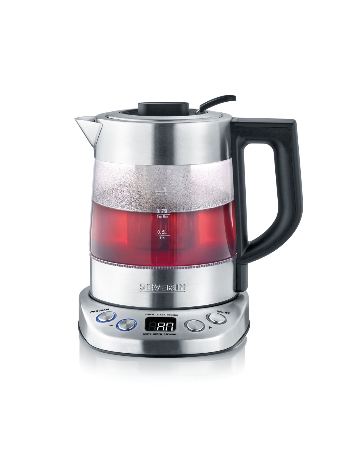 • Un filtre à thé en acier inoxydable avec poignée de sécurité est inclus.
