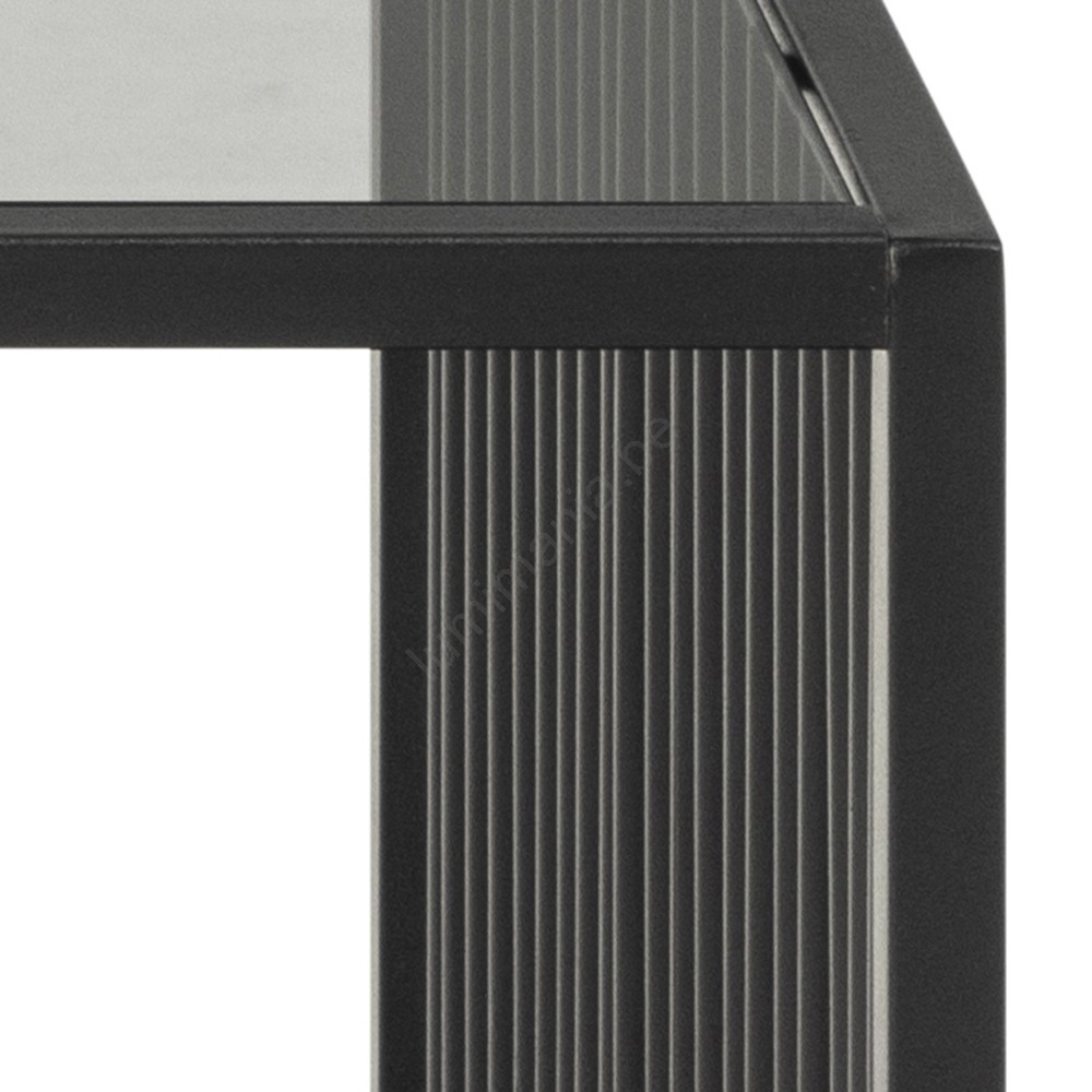 • Plateau en mélamine Izmir noir mat à finition grainée et verre trempé fumé, base en acier laqué poudré noir mat avec compartiment ouvert.