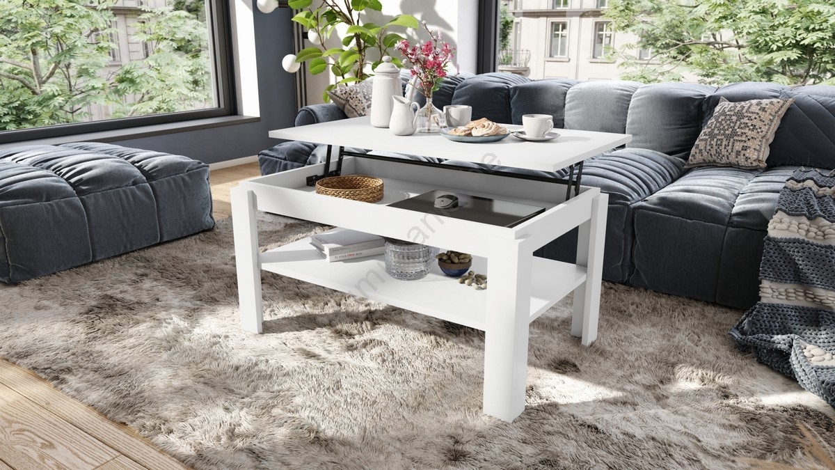 • Table basse convertible avec plateau relevable et étagère ADEN blanche
