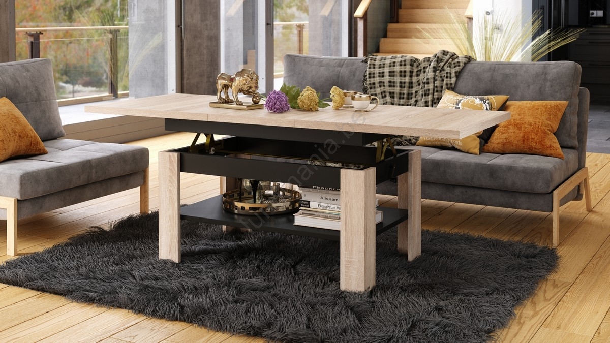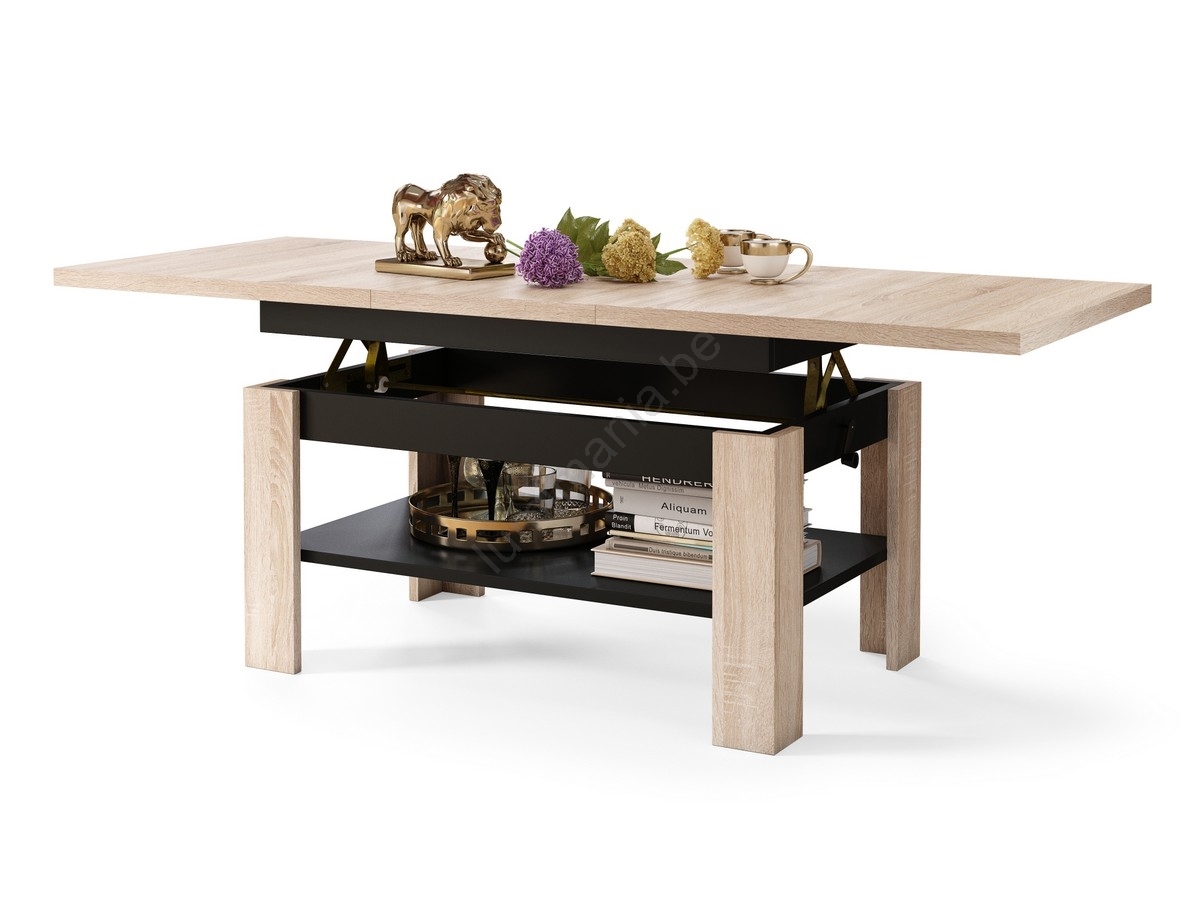• Table extensible (basse/à manger) ROY avec plateau relevable, chêne sonoma / noir