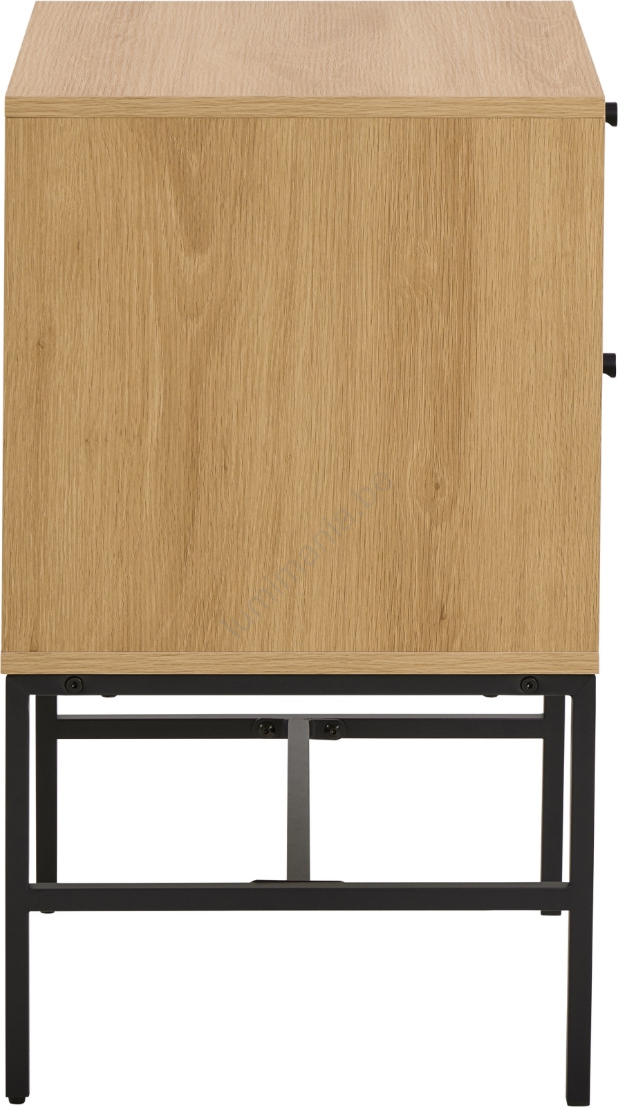 • Cadre, plateau et 2 tiroirs en mélamine structurée 'Craft', piètement en acier laqué par poudrage noir mat.