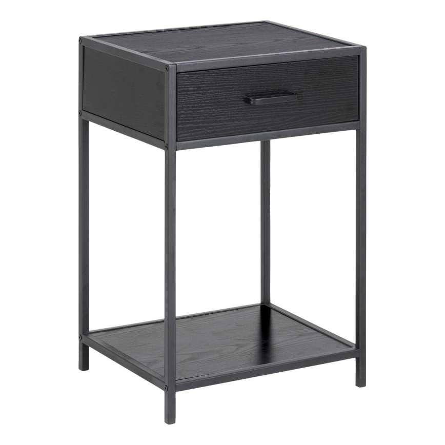 • Plateau supérieur, cadre, tiroir et étagère en mélamine noire rugueuse, socle en acier noir mat avec finition rugueuse et glissières métalliques.