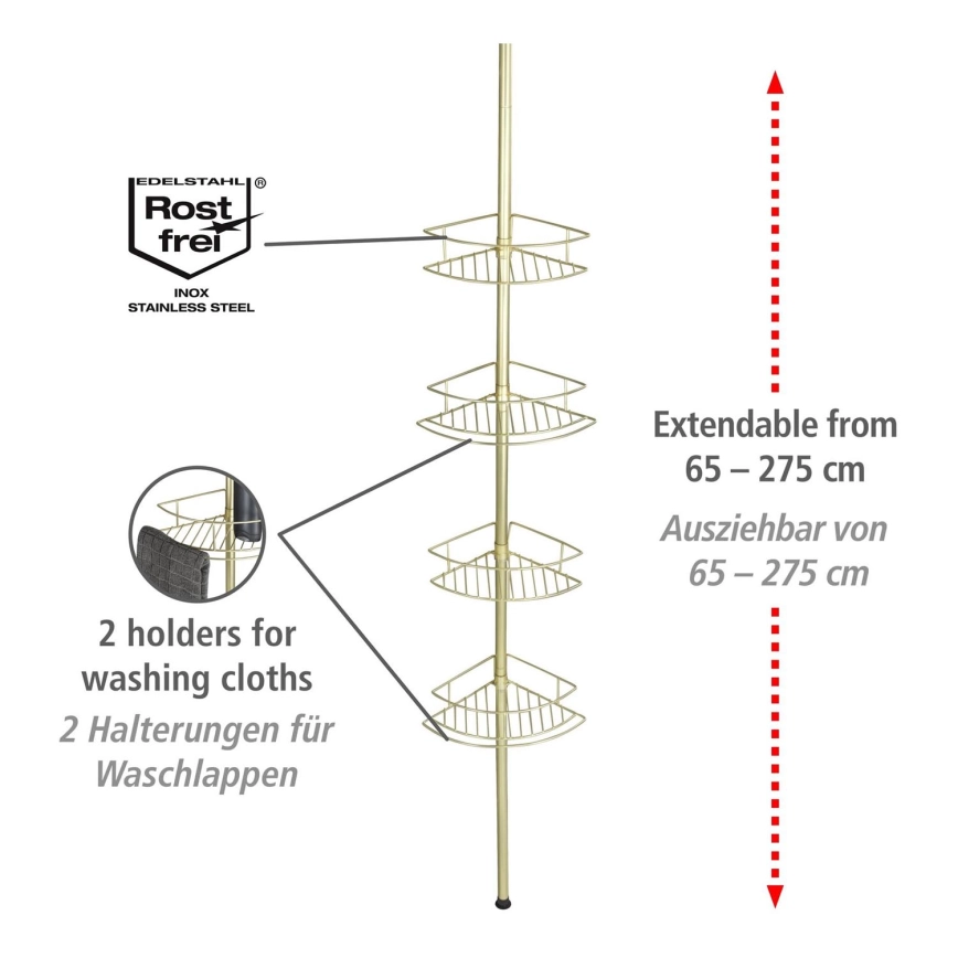• Étagère d'angle télescopique, adaptée à la douche, à la baignoire et aux coins de la pièce.