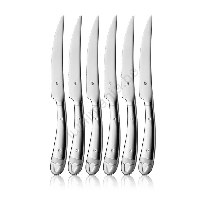 • Ensemble de 6 couteaux à steak de la collection WMF conçu pour une découpe facile et nette des viandes grillées et des steaks.