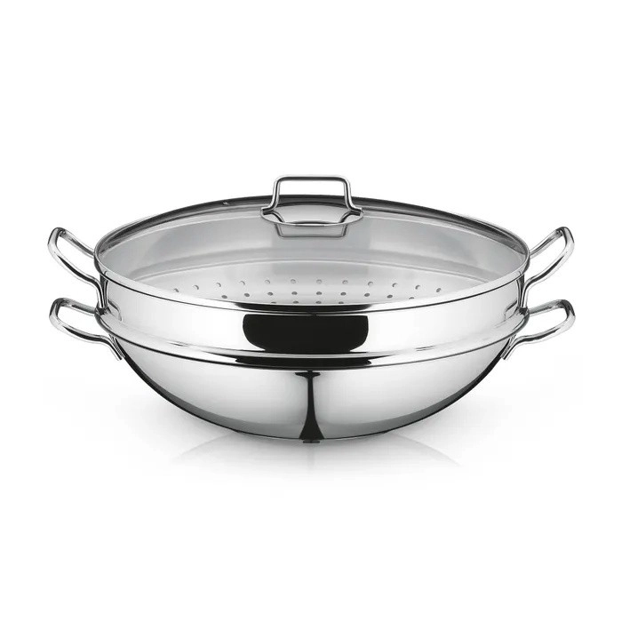 • Set complet 4 pièces : l’ensemble comprend un wok de 36 cm de diamètre, un couvercle en verre, un insert vapeur perforé et une grille de repos en inox pour maintenir les plats à la bonne température.