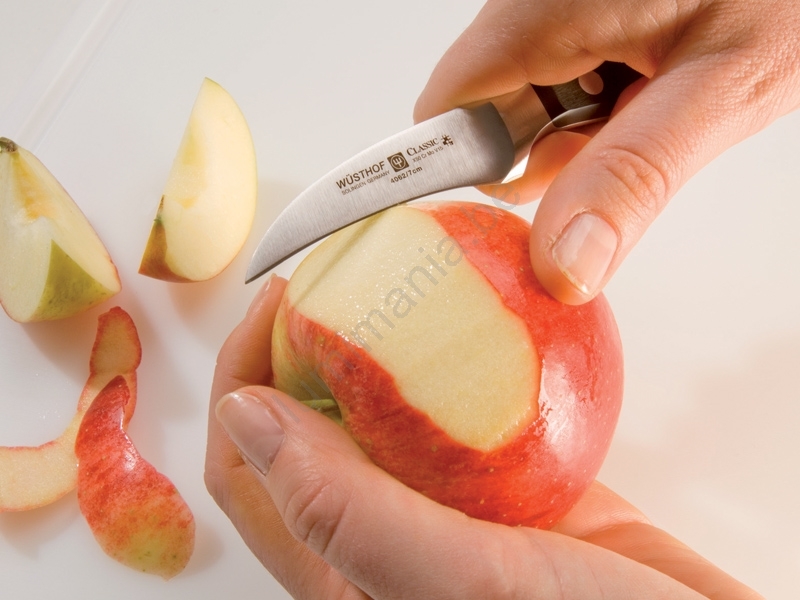 • La forme particulière du couteau à éplucher est idéale pour éplucher, nettoyer ou découper tout fruit ou légume à surface ronde.