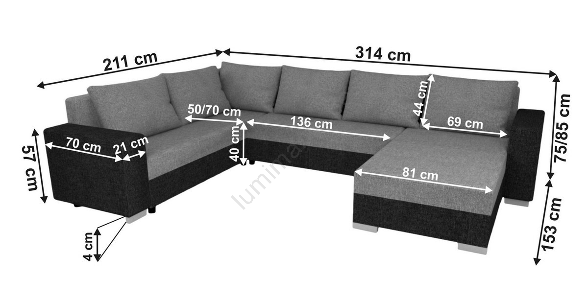 • Gestoffeerde universele U-vormige slaapbank YORK, grijs/zwart