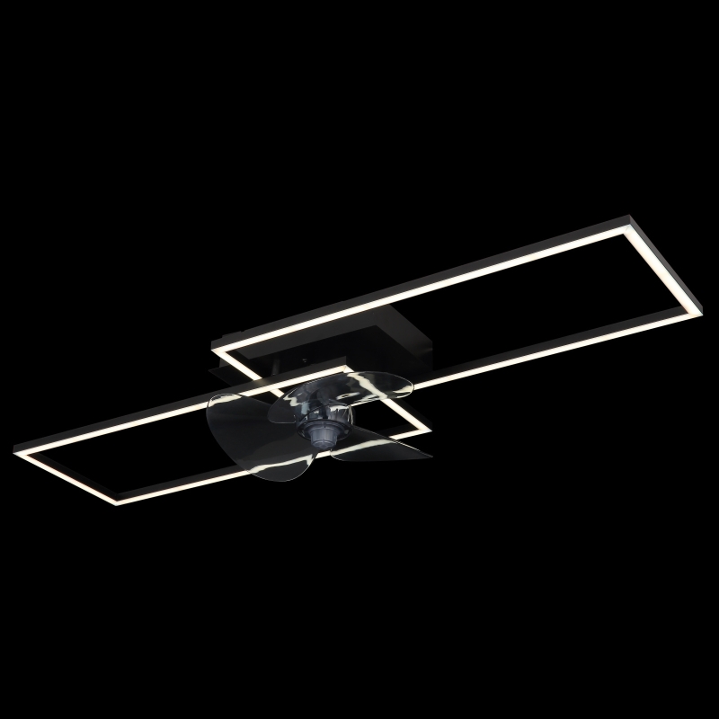 • Stijlvolle plafondventilator in mat zwart met opalen accenten.