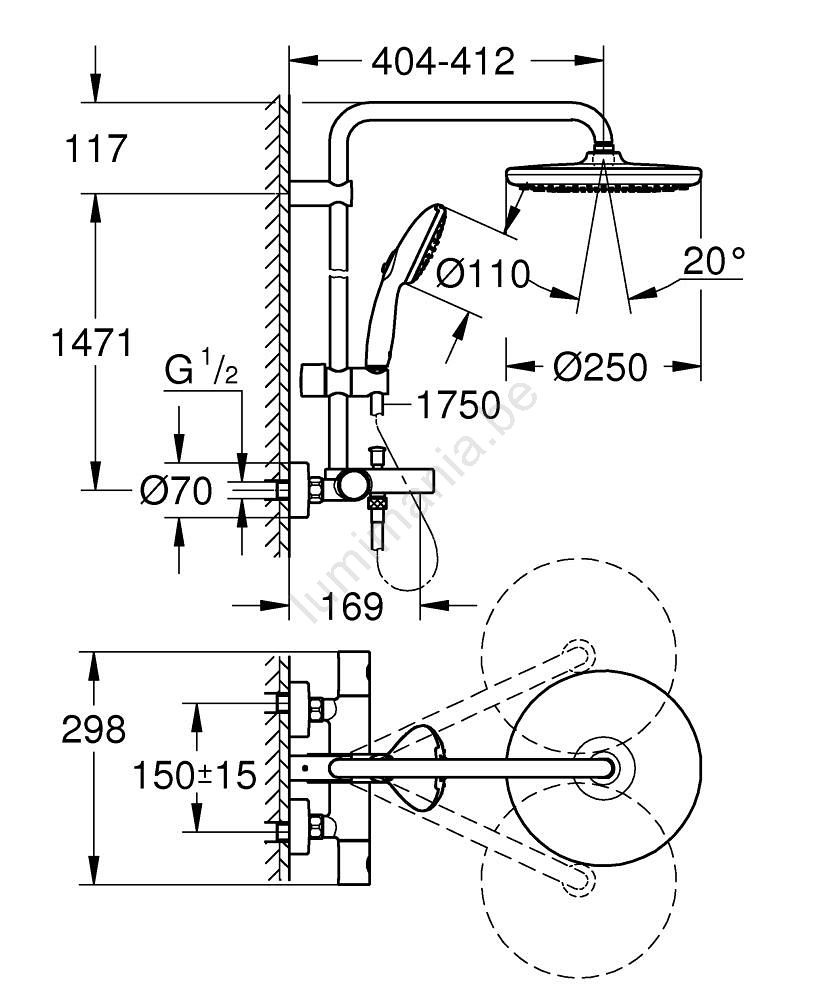 • Wandthermostaatkraan met Aquadimmer-functie maakt eenvoudig schakelen mogelijk tussen hoofddouche, handdouche en baduitloop.