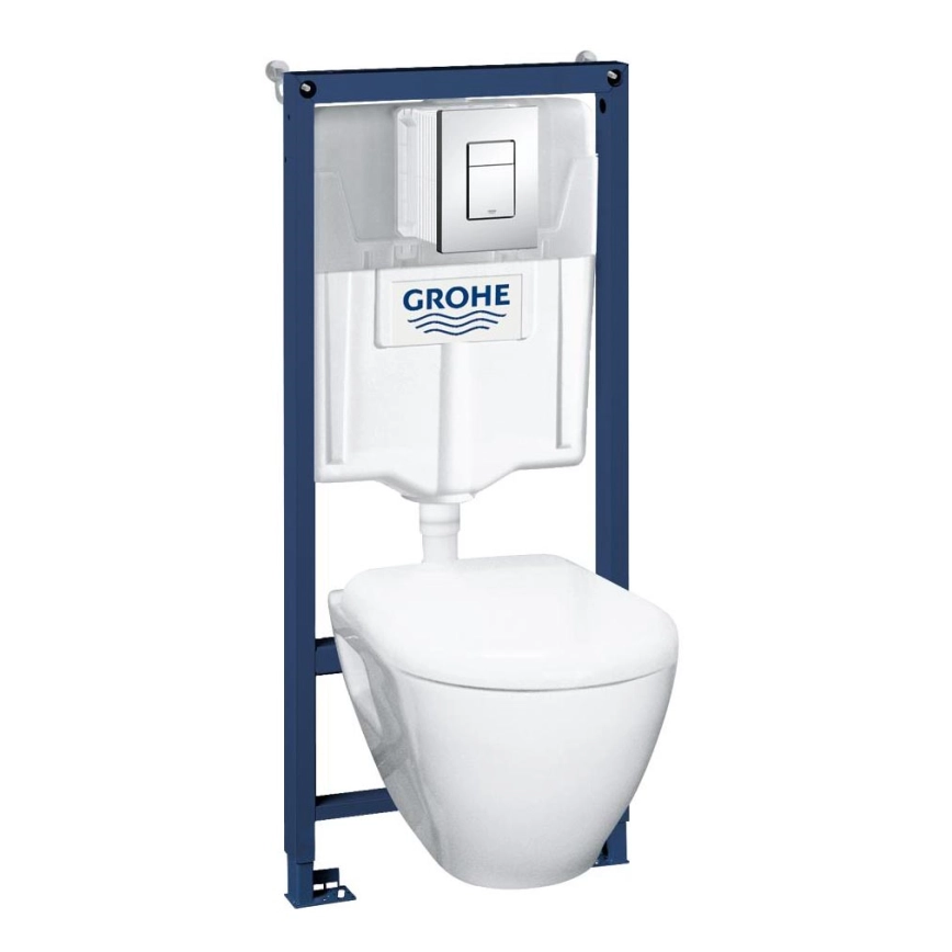 • Complete 4‑in‑1 set voor de installatie van een hangend toilet, inclusief spoelreservoir, stalen frame, keramische pot en spoelknop.