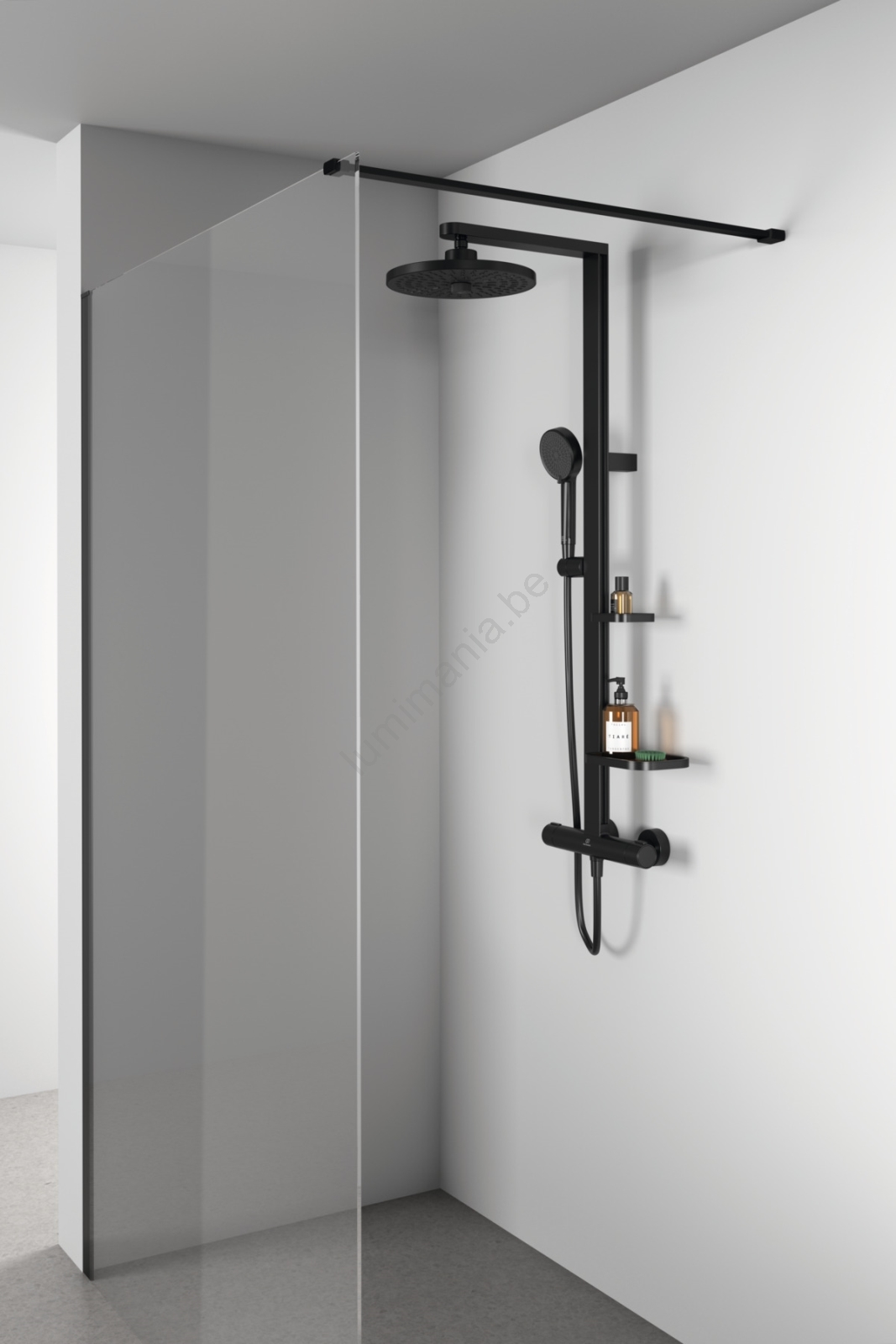 • De stang bevat een schuifbare houder voor de handdouche en twee in hoogte verstelbare schappen (een plank en een zeepschaaltje).