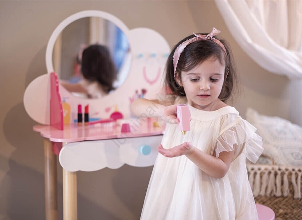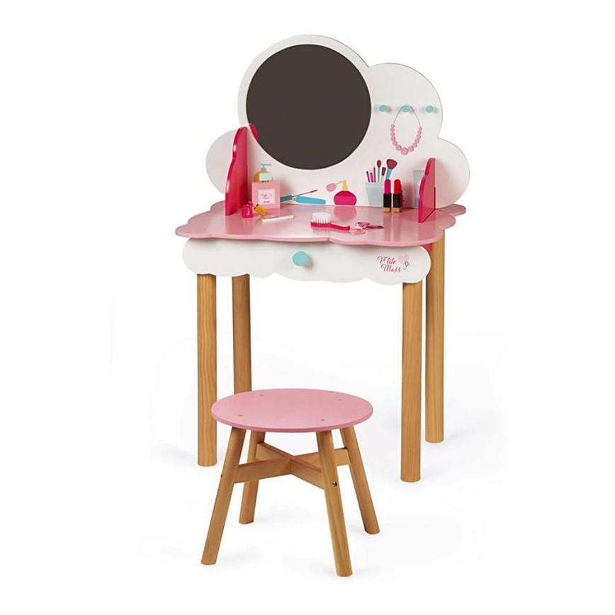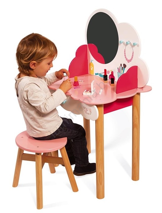 • Het tafeltje wordt geleverd met een houten stoel en extra houten accessoires: een spiegel, een roze haarborstel, twee roze haarspeldjes en een haar elastiekje, parfum, twee lippenstiften, nagellak, een nagelvijl en een oogschaduwpalette.