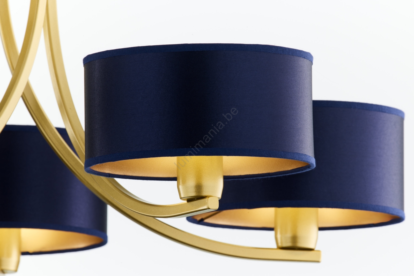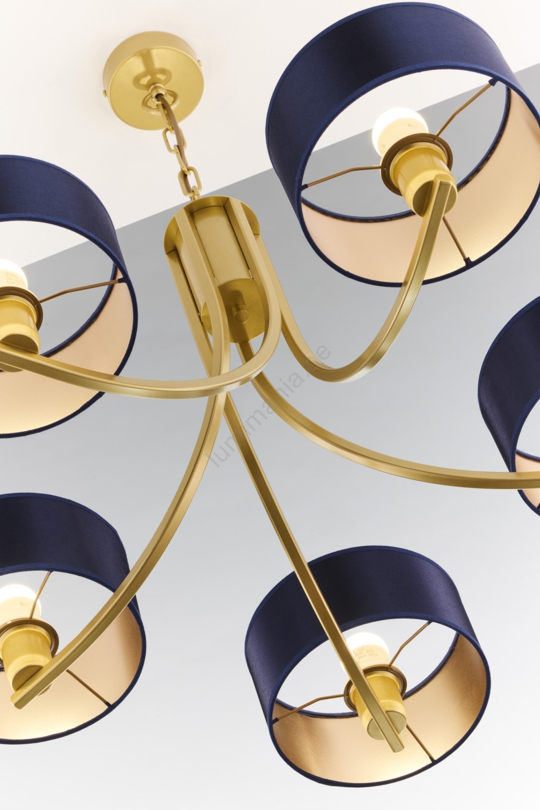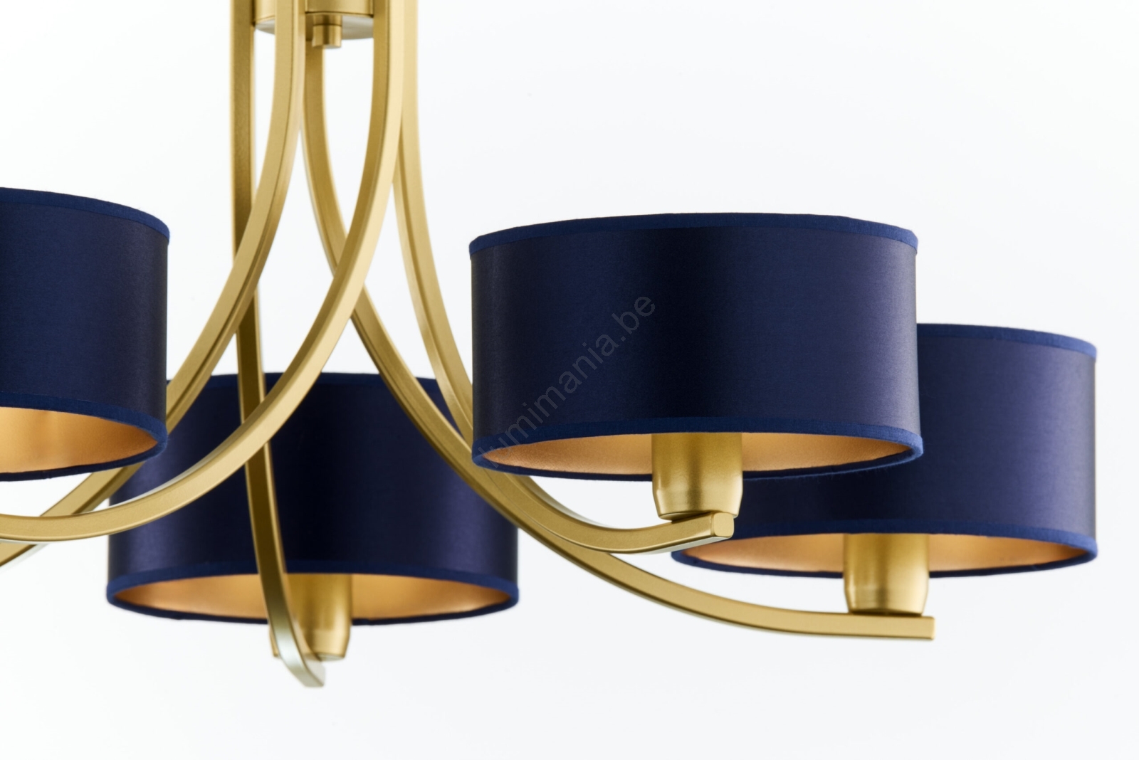 Jupiter 2094 - Kroonluchter met ketting ARTHUR 5xE27/15W/230V blauw/goud kenmerkt een mooi en functioneel ontwerp.  Voor het licht is een lamp met E27 fitting geschikt. Hier kunt u andere lampen tegen voordelige prijzen kopen. U heeft een interessante aanwinst voor uw woning.