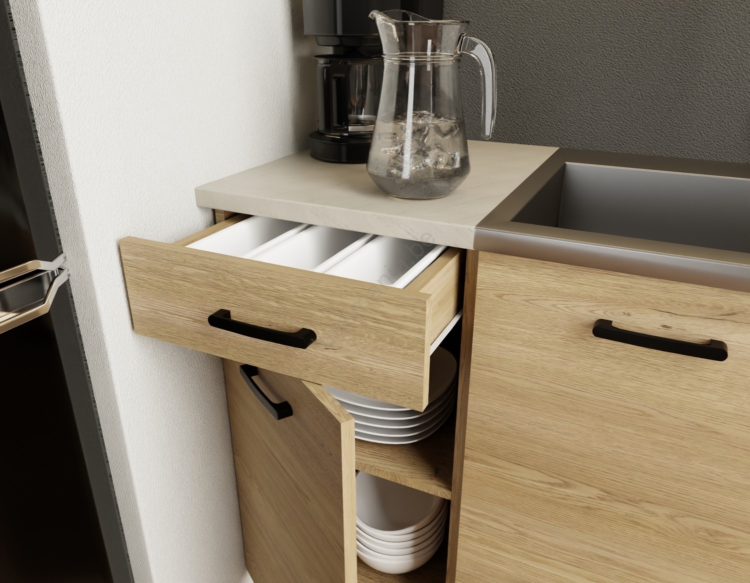 • De indeling van de kasten is modulair, u kunt de keuken naar uw eigen wensen indelen.