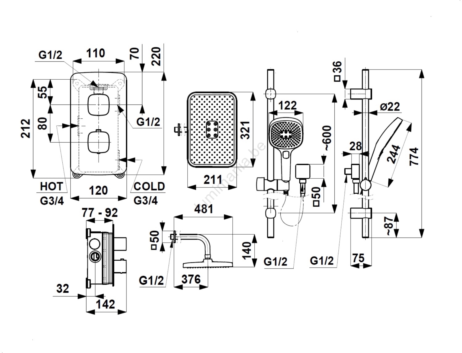 • Verpakking bevat: inbouwdoos, complete kraan, wandarm, douchekop met slang, inbouw verstelbare handdouche.