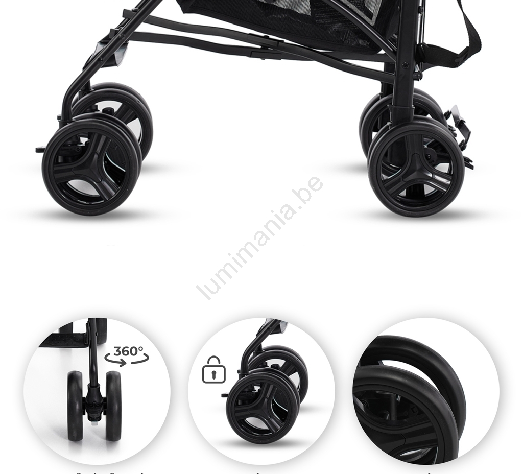 • De kinderwagen heeft lekvrije wielen die licht en bestand zijn tegen doorboringen.